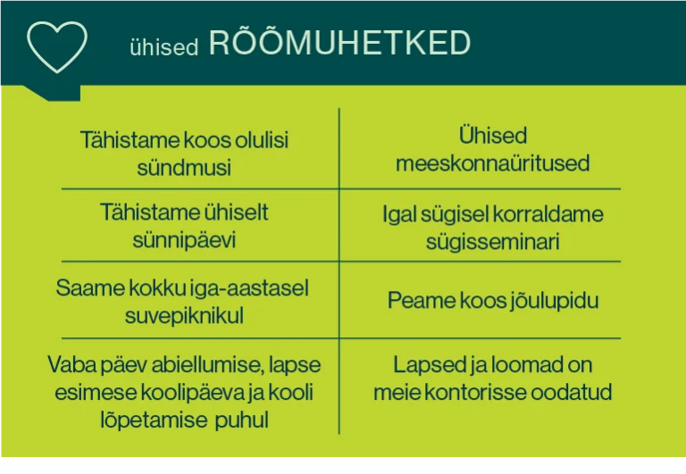 Hetkel töötab meie Tallinna ja Tartu kontoris kokku 95 inimest. Toetame tervislikke eluviise, soosime kaugtööd ja paindlikku tööaega. Väärtustame eesmärkidele pühendunud ennastjuhtivaid inimesi, reaalseid tulemusi, südamega tehtud tööd ja soovi panustada eesti keele arengusse.